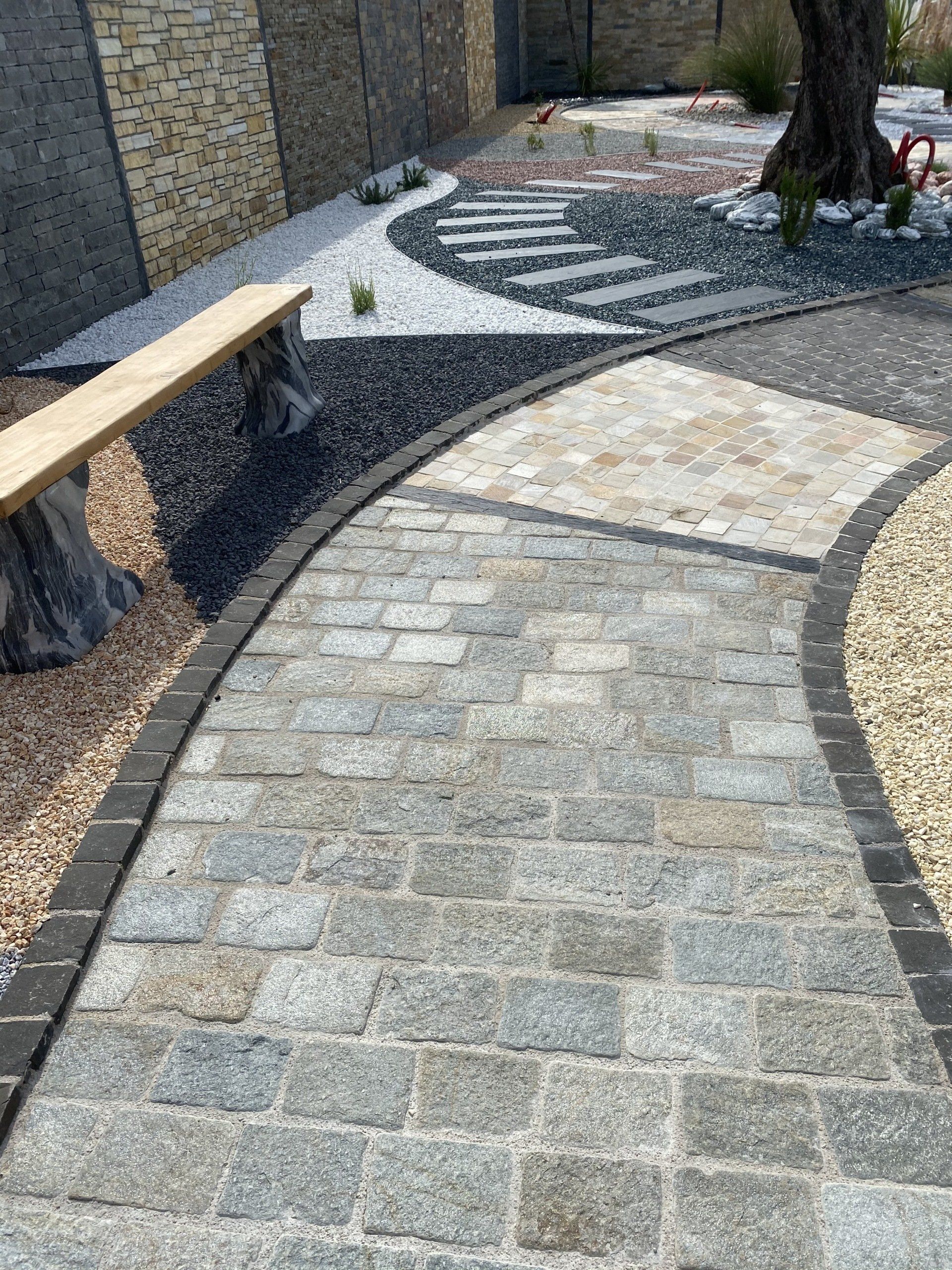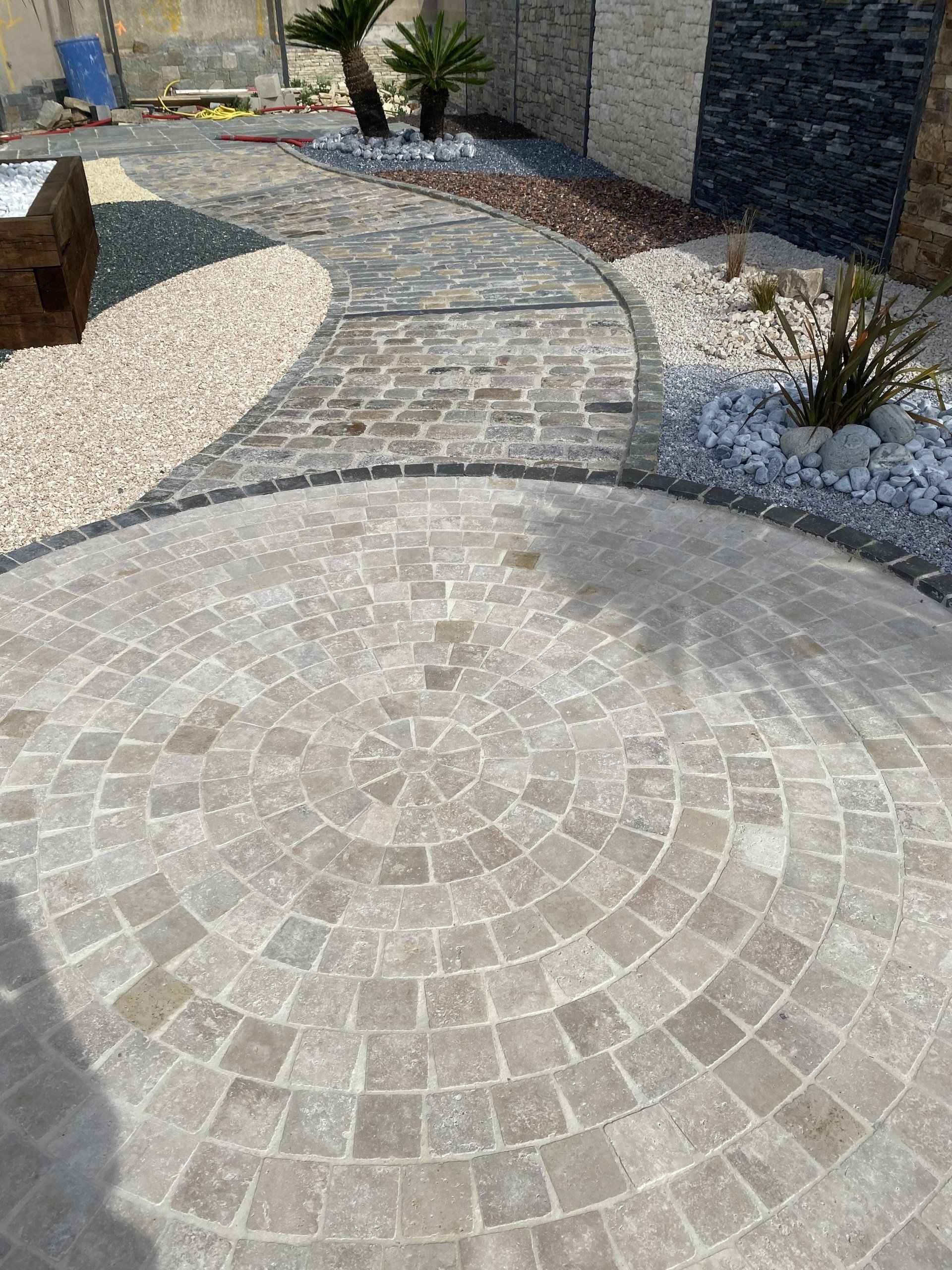 Réalisation de cours d'accès, d'espaces de stationnement : préparation des sols et revêtement par gravillons, pavés ou divers enrobés.